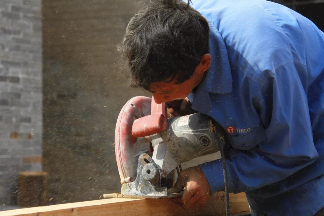 工人师傅们奋战在项目一线,昼夜施工,为青龙古镇重换新颜全力以赴,他们个个精神抖擞在挥臂劳作,一片热火朝天的景象。木料加工现场